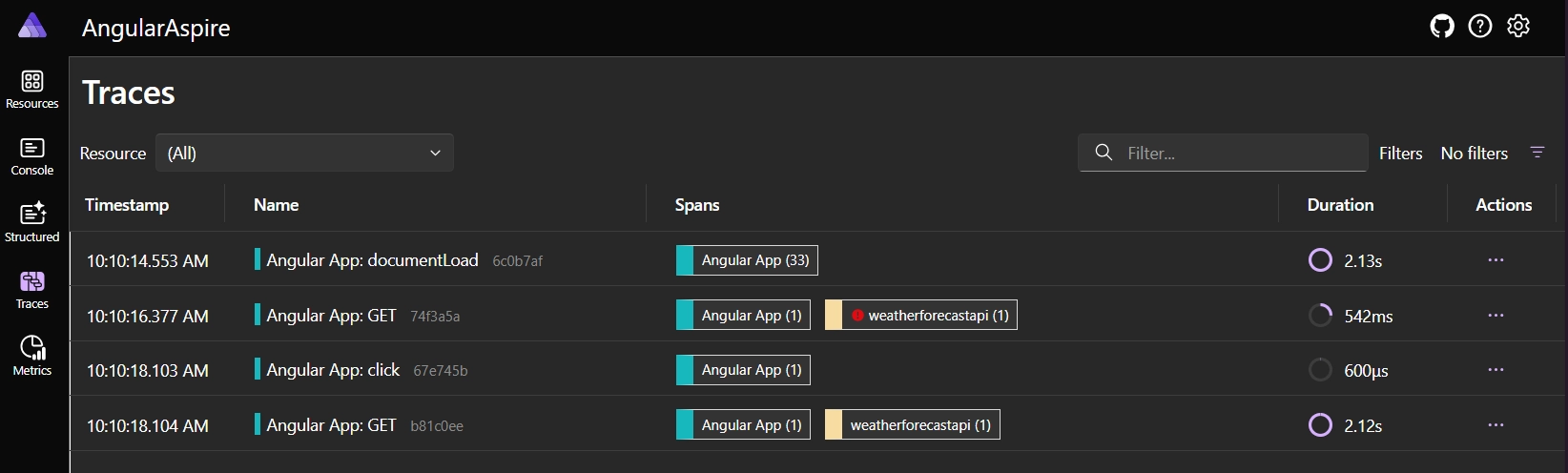 After this blog post, you will be able to follow the traces within the .NET Aspire Dashboard, starting from the Angular application to the .NET backend API (and external services if you have them, such as SQL server or other services).